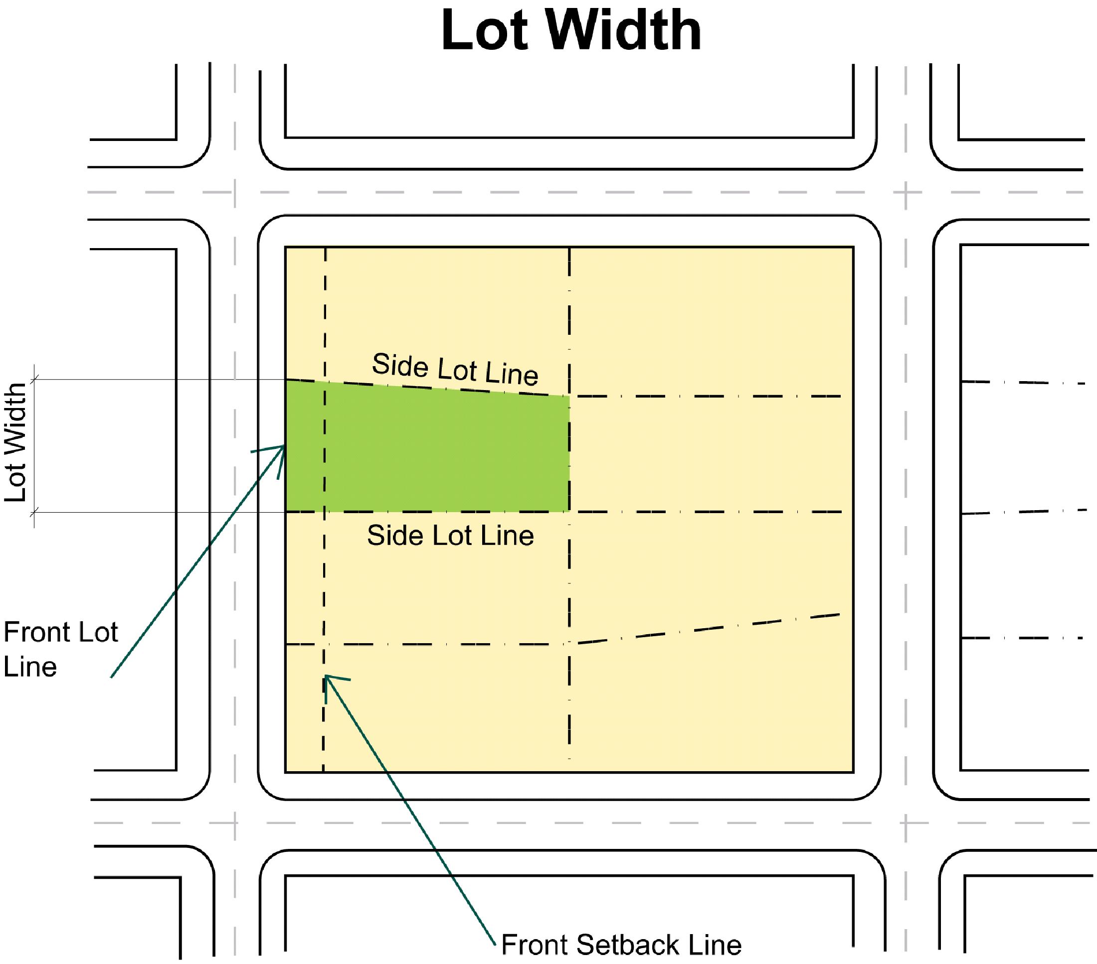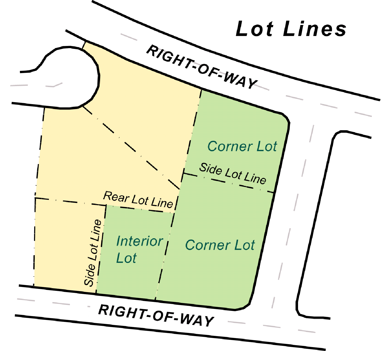 | Yard, Front | An area measured between the edge of the public street right-of-way line, and the front of a building, projected to the side lot lines. On corner lots, the front yard shall be measured perpendicular from the street lot line having the shortest linear footage. If both street lot lines have equal linear footage, the property owner shall determine the location of the front yard where no principal structure is located. If a principal structure is located on such a lot, the front yard shall be based on the architectural orientation of the building. The determination of front (side and rear yards) in a planned multi-tenant development shall be considered on a case-by-case basis. |