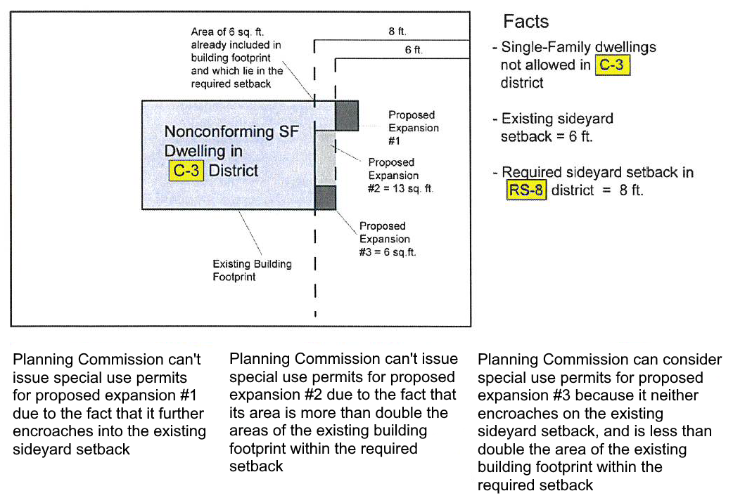 Notwithstanding, such Special Use Permit may only be issued by the Planning Commission for an expansion of an existing nonconforming structure if that expansion does not extend any closer to a property line than the existing structure and the expansion into a required yard setback does not more than double the area of encroachment already existing within that required yard setback. (Refer to Figure 3.3.4-1 below for an example of how this is to be interpreted.) Any occupation of additional lands beyond the boundaries of the lot on which the nonconforming use is located shall be prohibited.
