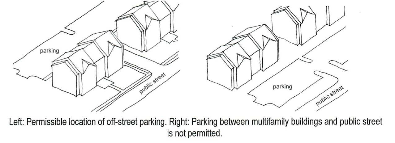 Parking. See Article 8 Parking. Off-street parking may be on and to the rear of the individual lots or in a common parking area in the interior of the development. Individual driveways are not permitted forward of the front building line.