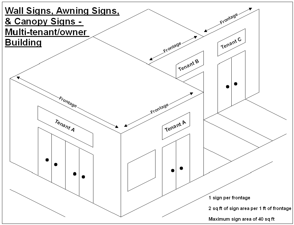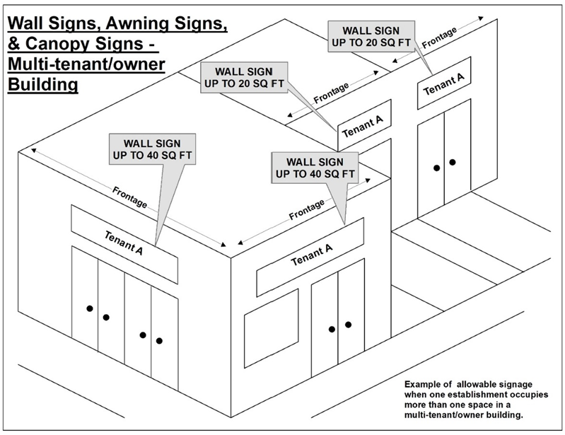 Multiple-Tenant/User Buildings: Where buildings have multiple storefronts and multiple tenants, signs and awnings should be coordinated with one another in terms of size, placement, lettering, color and design.