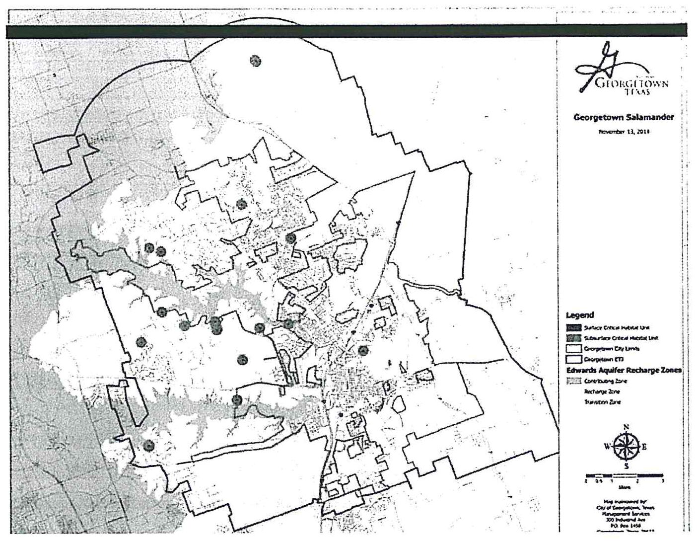 Occupied Site. Any spring identified as a critical habitat unit by the United States Fish and Wildlife Service for the Georgetown Salamander (Eurycea naufragia), and include the following: Cobb Well, Cobb Springs, Cowen Creek Spring, Bat Well Cave, Walnut Spring, Twin Spring, Hogg Hollow Spring, Cedar Hollow Spring, Knight (Crockett Garden) Spring, Cedar Breaks Hiking Trail Spring, Water Tank Cave, Avant's (Capitol Aggregates), Buford Hollow Springs, Swinbank Spring, Shadow Canyon, San Gabriel Spring, and Garey Ranch Springs. The locations of the Occupied Sites are shown on the map incorporated below.