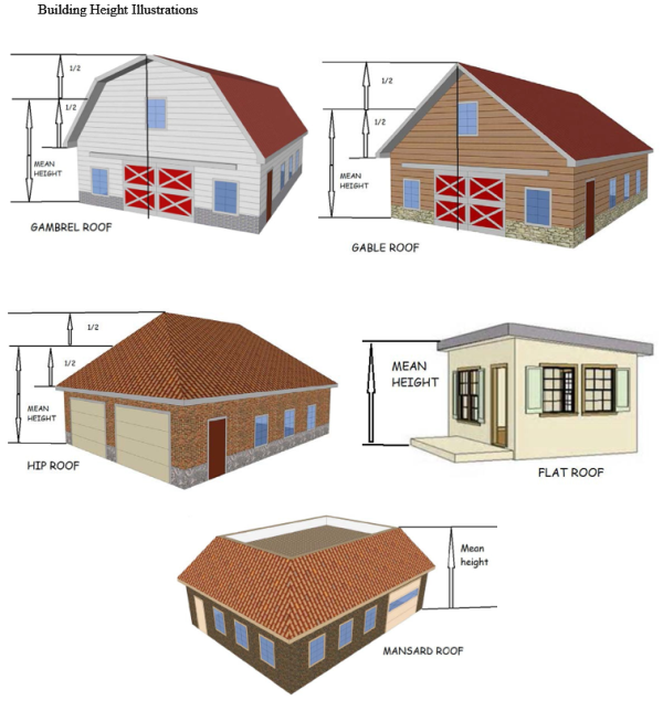 The building height is the vertical distance measured from the established grade to the highest point of the roof surface if a flat roof; to the deck of mansard roofs; and to the mean height level between eaves and ridge of gable, hip and gambrel roofs. When the terrain is sloping, the ground level is measured from the mean grade of all sides.