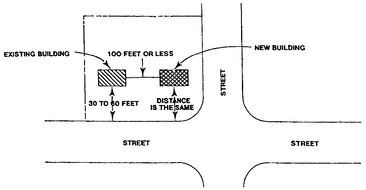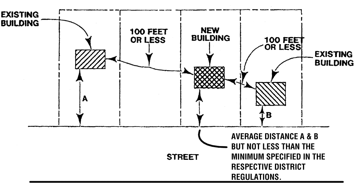 Where a new building will be constructed within 100 feet or less of existing buildings with varying front yard setbacks, the required front yard for the new building shall be the average of the front yard setbacks of the existing buildings, but not less than the minimum specified in the respective district regulations.