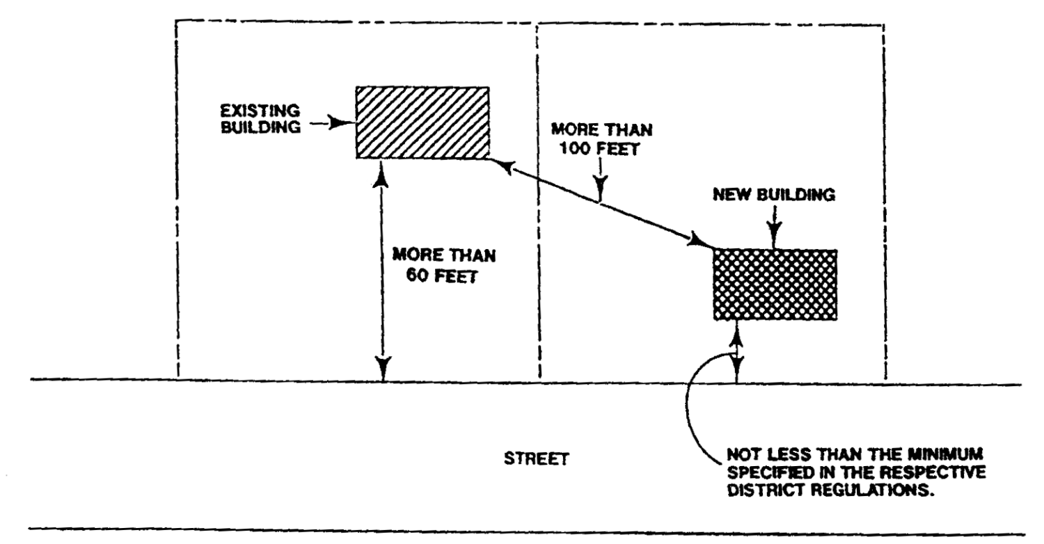 Where a new building will be constructed more than 100 feet from the existing buildings, the required front yard for the new building shall not be less than the minimum specified in the respective district regulations.