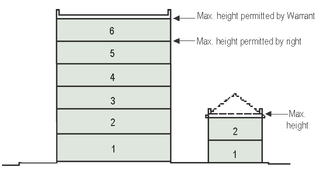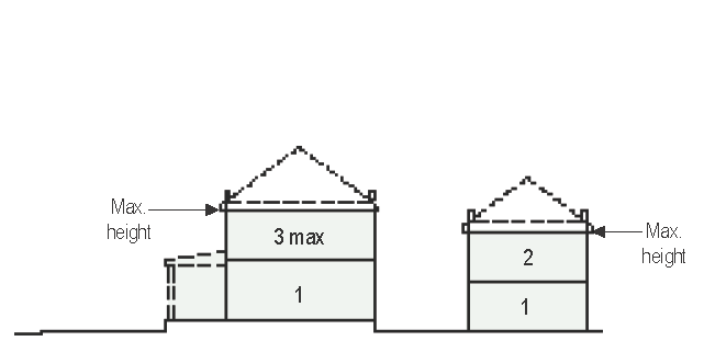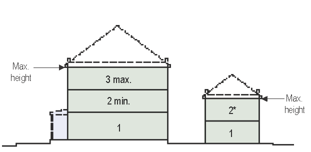 Three-story height maximum. Areas indicating the location where new buildings in smart growth zoning districts may not exceed three stories within 150 feet of the property line of abutting, low density, residentially zoned property (RE-10, R-E, R-E-1, R, R-1, R-2, R-3) that contain existing single family uses.