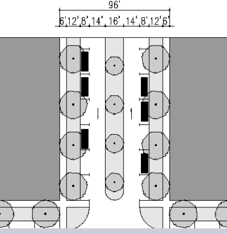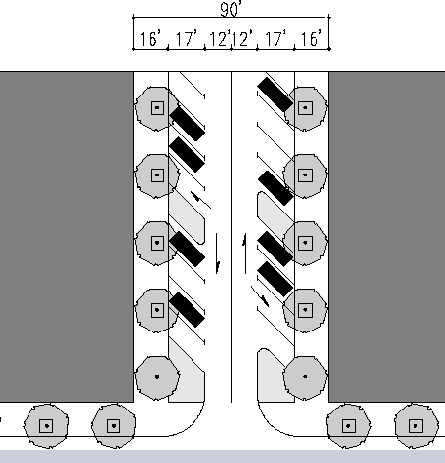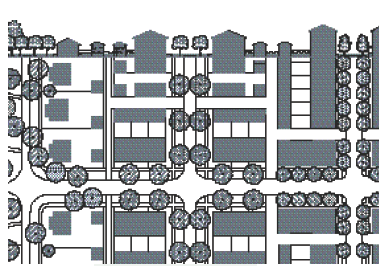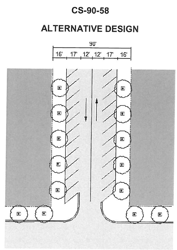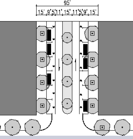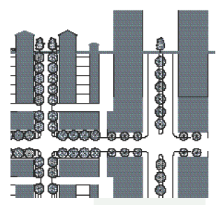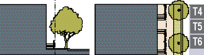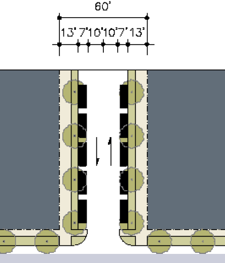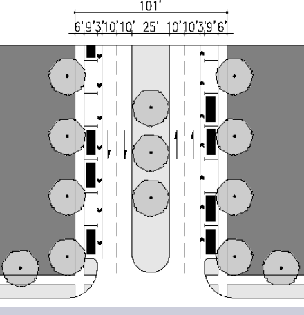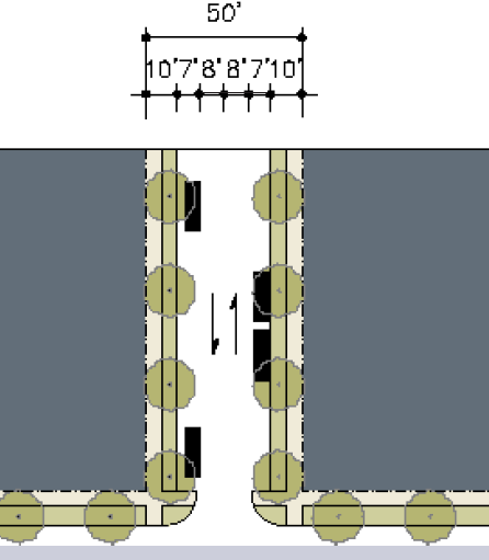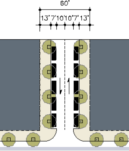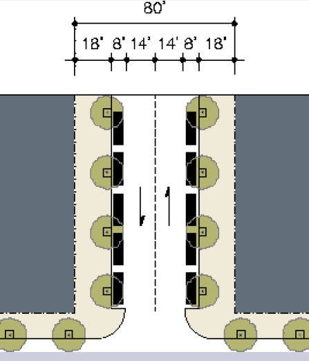 Street (ST) means a local urban thoroughfare of low speed and capacity. Its public frontage consists of raised curbs drained by inlets and sidewalks separated from the vehicular lanes by a planter and parking on both sides. The landscaping consists of regularly placed street trees. This type is permitted within the more urban SmartCode zoning districts (T4—T6).