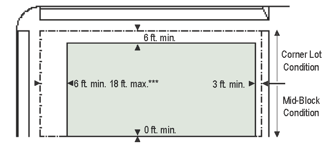 Public frontage means the area between the curb of the vehicular lanes and the frontage line. Elements of the public frontage include the type of curb, walk, planter, street tree and streetlight.