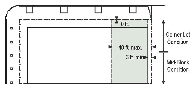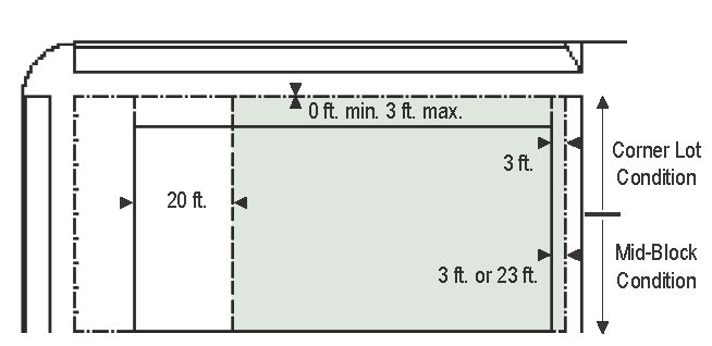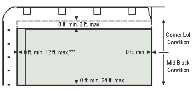 Rearyard building means a building that occupies the full frontage line, leaving the rear of the lot as the sole yard. This is a more urban type, as the continuous façade spatially defines the public thoroughfare. For its residential function, this type yields a rowhouse. For its commercial function, the rear yard can accommodate substantial parking.