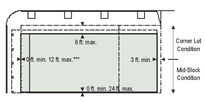 Setback means the area of a lot measured from the lot line to a building façade or elevation. This area must be maintained clear of permanent structures with the exception of: galleries, fences, garden walls, arcades, porches, stoops, balconies, bay windows, terraces and decks (that align with the first story level) which are permitted to encroach into the setback.