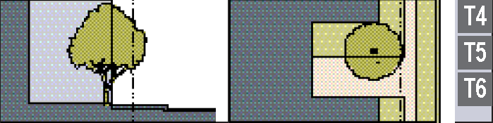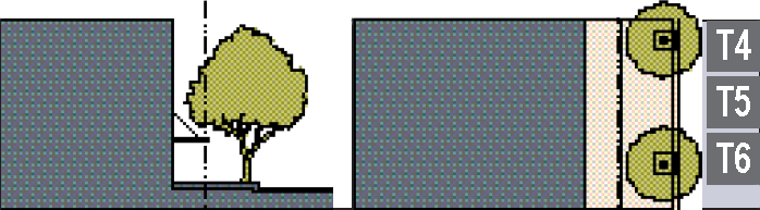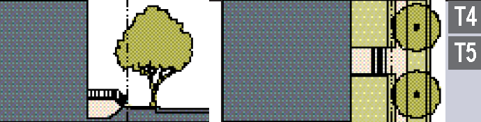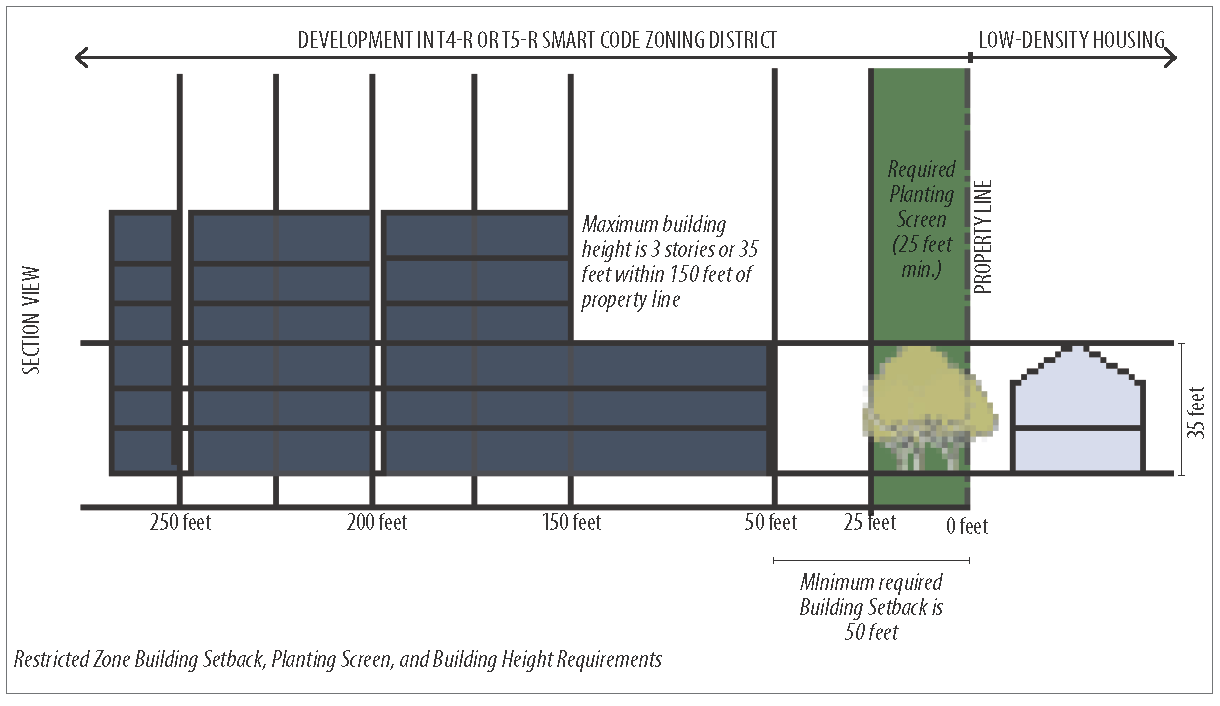 Required buffer. The regulating plan designates areas where new developments in T-4 and T-5 zones abut properties used for single family residential development in low density residential districts (RE-10, R-E, R-E-1, R, R-1, R-2, R-3) and where a 25-foot planting screen shall be provided to provide a transition between the smart growth zoning districts and the existing residential properties.