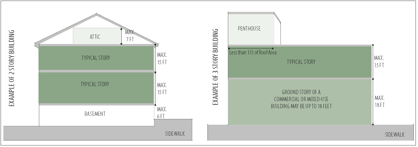 Story means a habitable level within a building measured from finished floor to finished ceiling. Attics, parking garages, raised basements are not considered stories for the purposes of determining building height.