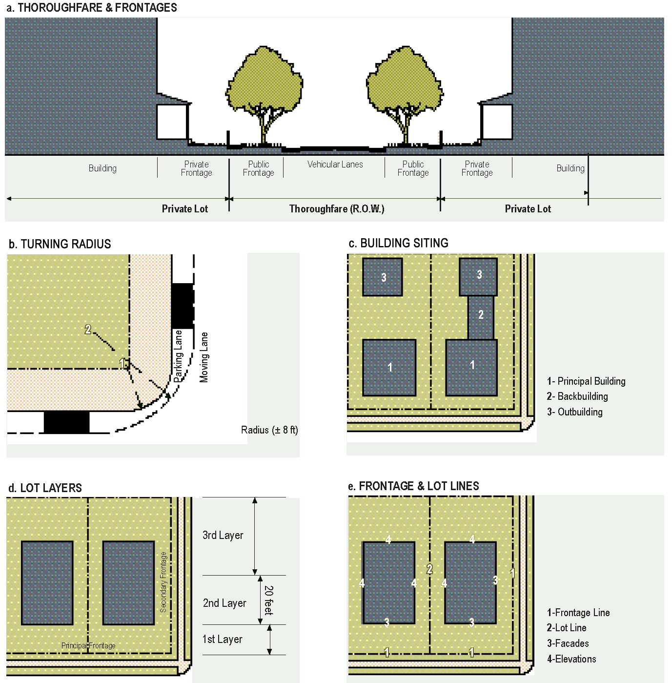 This table provides description of the general character of each SmartCode zoning district, based on the transect concept. The transect is a system of ordering human habitats in a range from the most natural to the most urban. The SmartCode is based upon 6 transect zones which describe the physical character of place at any scale, according to the density and intensity of land use and urbanism.