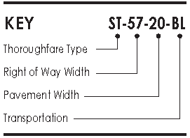 The following thoroughfare assemblies shall be implemented in accordance with section 23-810 of this article. The key gives the thoroughfare type followed by the right-of-way width, followed by the pavement width (face-of-curb to face-of-curb), and in some instances followed by specialized transportation capability. Where no specific street name is assigned, the assembly may be used in new development. Otherwise, assemblies are specific to existing or proposed streets.
