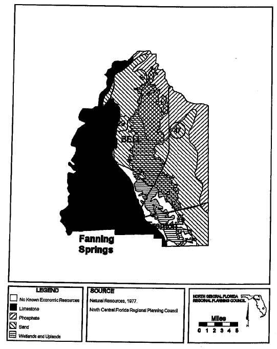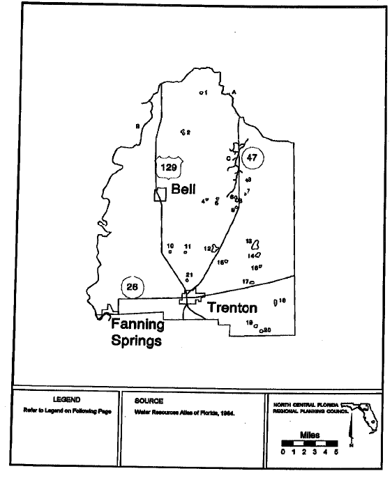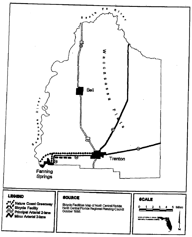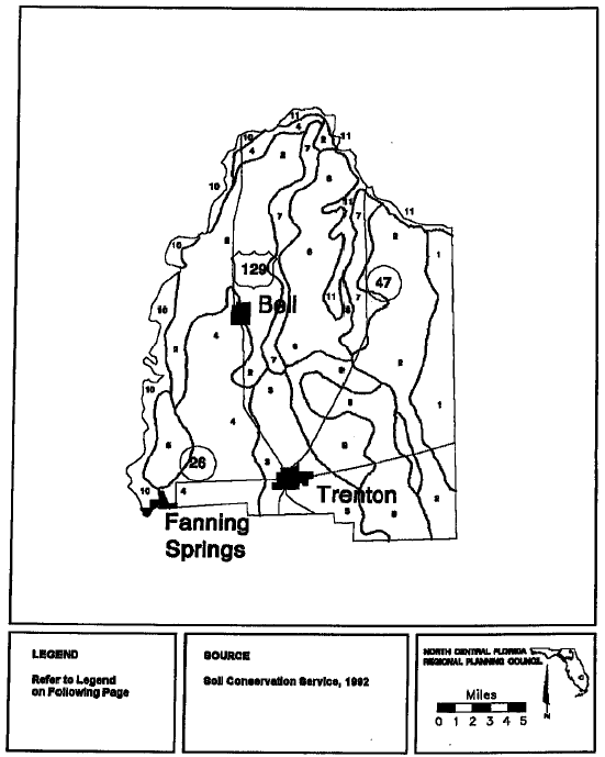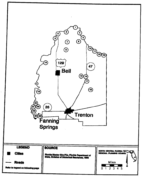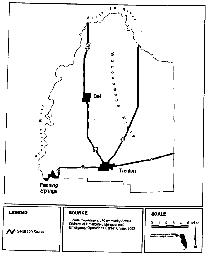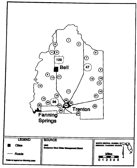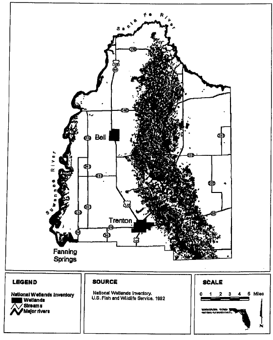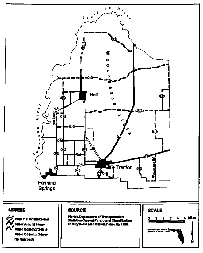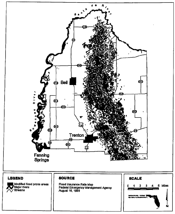 The unincorporated area of Gilchrist County is approximately 350 square miles or 215,631 acres in area. The County is located in the north central portion of the State of Florida and is bordered on the north by Columbia and Suwannee Counties (and separated by the Santa Fe River), on the east by Alachua County, on the south by Levy County, and on the west by Dixie and Lafayette Counties (and separated by the Suwannee River) as shown on the following location map.
