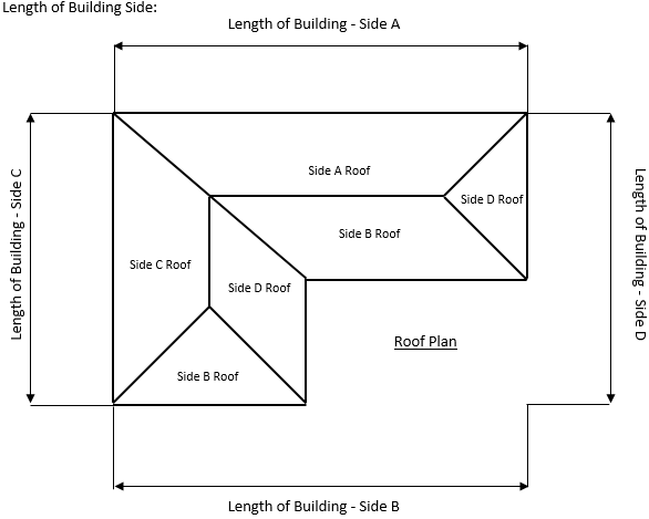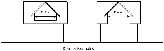 If side B in the diagram above were 60 feet wide, a total of 15 feet of dormers (60 feet x 25% = 15 feet) could be located anywhere within the side B roof areas, provided they meet the criteria 1-3 above.