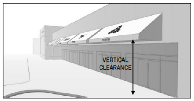 Canopies shall not be placed in a manner that reduces the minimum width or vertical clearance of any required drive aisle.
