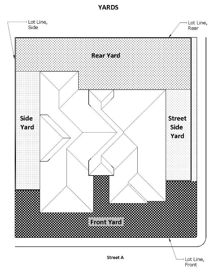 Yard: Open space on the same lot with a building or group of buildings, lying between the building (or outer building of a group) and the nearest lot line and unoccupied and unobstructed from the ground upward.