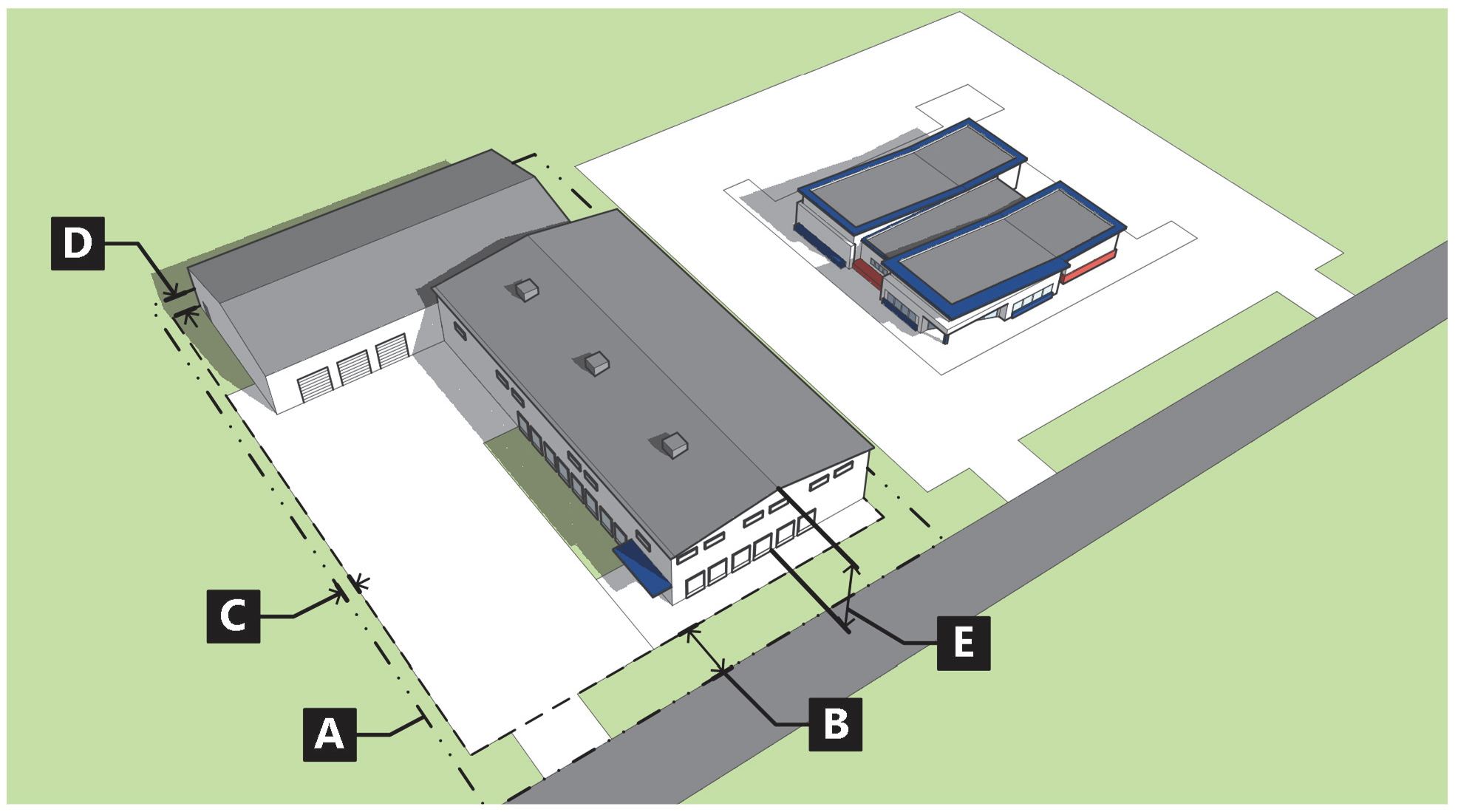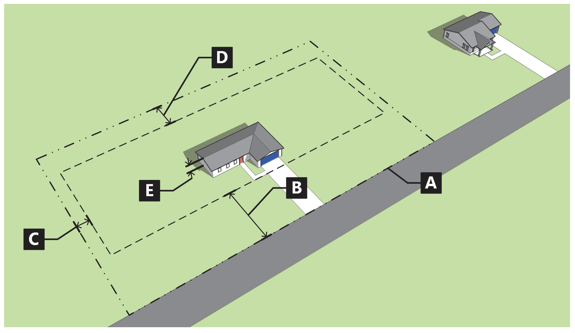 Each base zoning district includes an illustration demonstrating the dimensional requirements for that district. The illustrations are not intended to represent a specific location, but rather reflect the general character of the district.