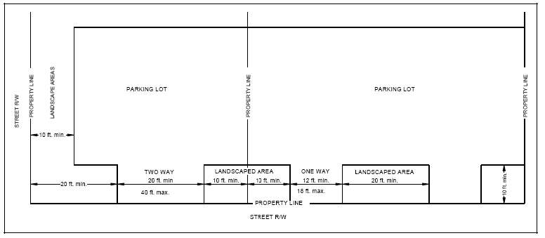 Design. As indicated in the diagram below, all areas of the parking lot, with the exception of necessary points of ingress and egress, shall be no closer than ten feet from the front and exterior side yard property lines. That unoccupied area shall be landscaped and maintained with trees, shrubs, ground cover, pedestrian walkways, and plazas in a manner acceptable to the Zoning Administrator. Such landscaping shall be maintained and kept in a weed-free manner. Access to off-street parking areas from a public street shall be from a two-way driveway with a minimum width of 20 feet and a maximum width of 40 feet, or two one-way driveways each with a minimum width of 12 feet and a maximum width of 18 feet. No access driveway shall be located closer than 20 feet from a street intersection or other access driveway, nor any closer than ten feet from any property line unless extraordinary circumstances are demonstrated and approval is granted through the design and site plan review process.
