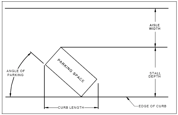 Minimum parking space dimensions shall be nine feet by 18.5 feet at various angles.