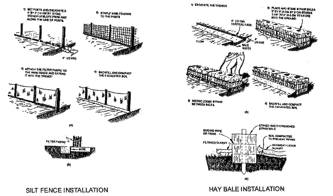 A construction water control plan shall accompany all permit applications for new development orders submitted pursuant to section 34-35 and also for all building permits for rehabilitative and maintenance projects. These plans should clearly demonstrate how stormwater runoff will be moved throughout the site during construction. Typical management techniques include use of staked hay bales, prefabricated silt fence, temporary swale and ponding areas. Typical methods that may be used are shown in Figure XIV-1. Applications shall also specify the types and frequency of routine inspections to be used for systems established to meet these requirements. Maintenance should be performed immediately upon detection of a problem.