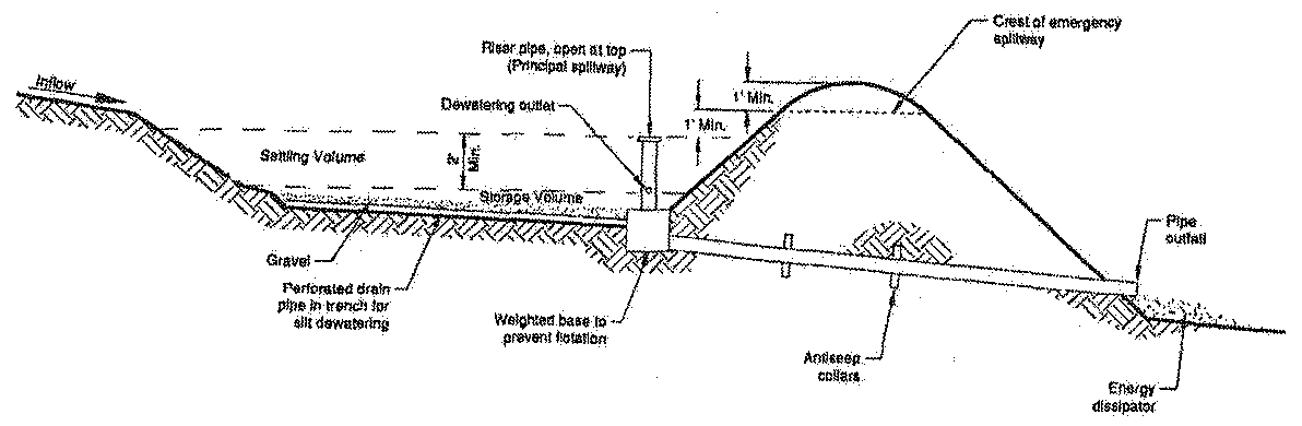 Silt laden water must be treated prior to discharge offsite. Where required, sedimentation ponds shall be used for settling purposes. Sedimentation traps, grassed swales and filtration through vegetated areas may also be approved as a means to remove sediment. A typical sedimentation pond is depicted in Figure XIV-2.