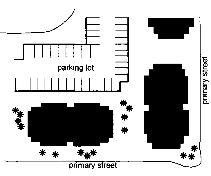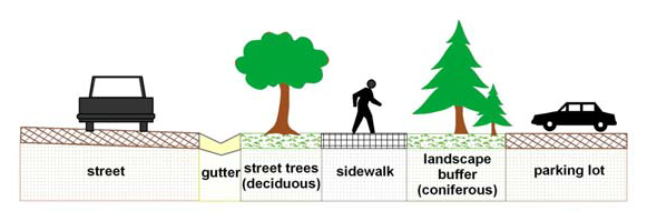 Deciduous trees should be the predominant large plant material used. They should be located adjacent to buildings and within parking areas to provide shade in summer and allow sun in winter. Species should be selected to be drought-tolerant, provide fall color and minimize litter and other maintenance problems.