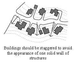 Residential structures should be set back from the front property line, centered within the lot and occupy one-third to one-quarter or less of the lot area.
