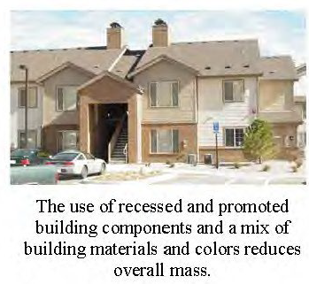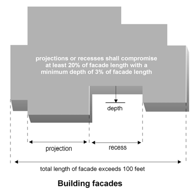 Use of building step backs at upper floors or building overhangs is encouraged to create more visual interest.
