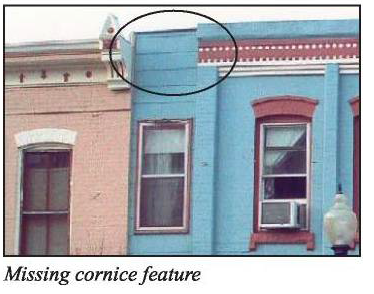 Cornices: This treatment shall be provided at the second floor (or roofline for a one-story building) to differentiate the storefront from upper levels of the building.