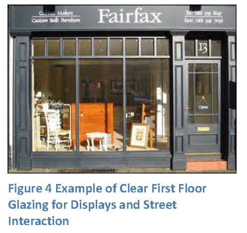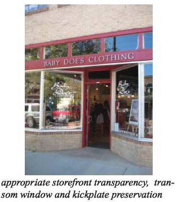 Display windows: Large pane windows shall be installed on the first floor encompassing a minimum of 60 percent of the commercial storefront surface area (Figure 4).