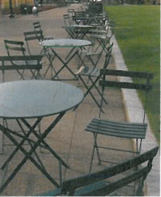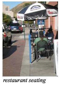 Portable seating, movable chairs, tables for cafes and other furniture should be of substantial materials; preferably metal or wood rather than plastic. Tables used for outdoor dining within the public right-of-way (i.e., in sidewalk areas) shall be a maximum of three feet in diameter if round and three feet along the longest side if rectilinear (Figures 6 and 7).