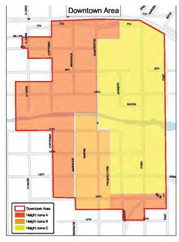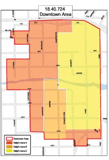 Zone A consists of the western portions of the downtown area, adjacent to the historic 8th and 9th Street and 12th Street historic neighborhoods. This zone consists primarily of one- and two-story buildings, with a couple of three-story structures. Zone A also includes the area along 14th Street west of East Street. The south side of 14th Street and the southerly 50 feet of the block north of 14th Street between East Street and Prospectors Alley lie within this zone. Notwithstanding the provisions of sections 18.28.200 and 18.28.210 of this title, no building greater than two stories above grade, with a maximum of 30 feet in height will be permitted except upon a finding by planning commission of compliance with the Tier 2 bonus criteria in subsection (5) below. No structure may exceed the maximum height limits for the applicable zone district.