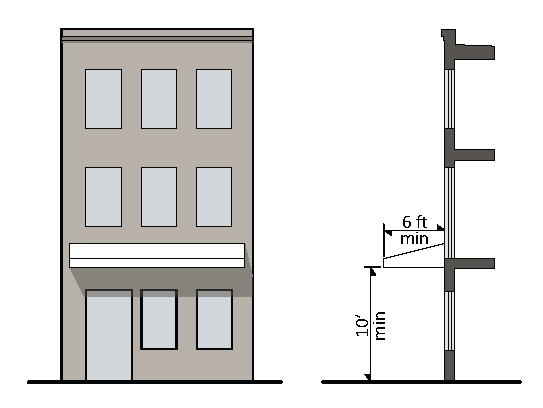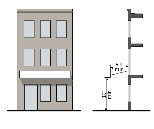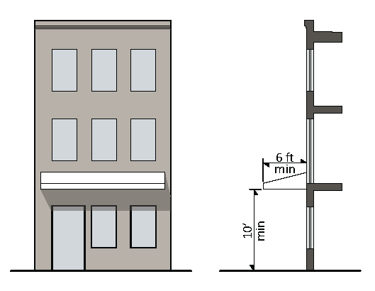 A ground-story awning or canopy must have a minimum clearance of ten (10) feet above the sidewalk and must have a minimum depth of six (6) feet.