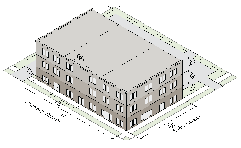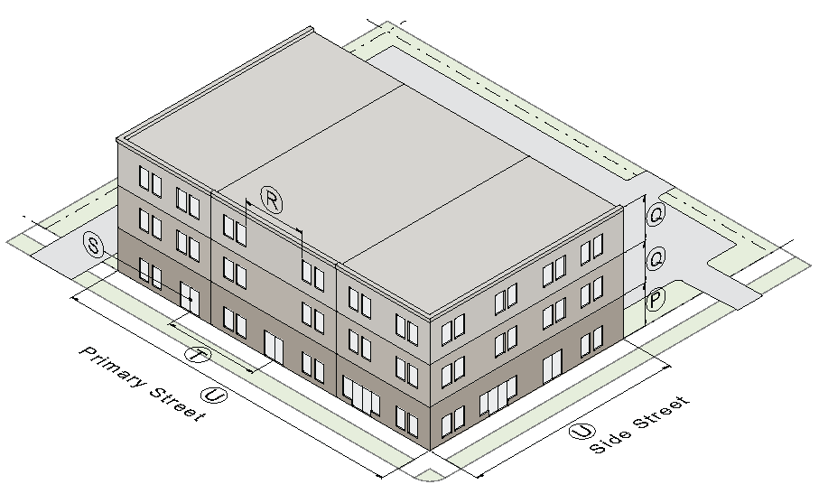 Primary street-level entries shall be made visually prominent and receive architectural emphasis. Possible techniques to accomplish this include but are not limited to: