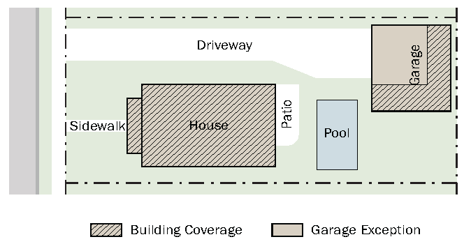 Building coverage does not include paved areas such as driveways, uncovered porches or patios, decks, swimming pools, porte cochere, or roof overhangs of two (2) feet or less.