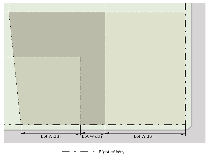 The build-to area is the portion of the lot that must be occupied with a building façade. The primary street and side street build-to areas are measured as a minimum and maximum setback range from the edge of the right of way.