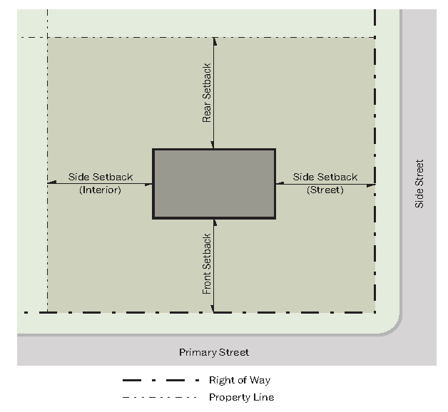 Front, side street, and parking setbacks are measured from the front lot line or the required right-of-way as determined by the master street plan, whichever creates the greater setback. When the city council by ordinance establishes a specific right-of-way line for a street, the front yard setback is measured from that right-of-way line. Interior side setbacks are measured from the side property line. Rear setbacks are measured from the rear property line or the edge of the right-of-way if there is an alley.