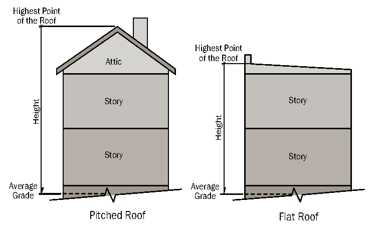 Structure height is measured in both number of stories and feet from the average grade to the top of the highest point of the roof.