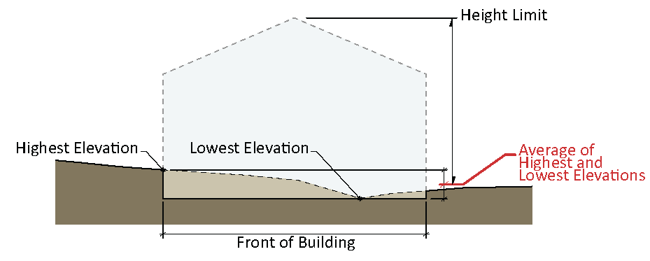 Average grade is determined by calculating the average of the highest and lowest elevation along natural or improved grade (whichever is more restrictive) along the front of the building parallel to the setback line.
