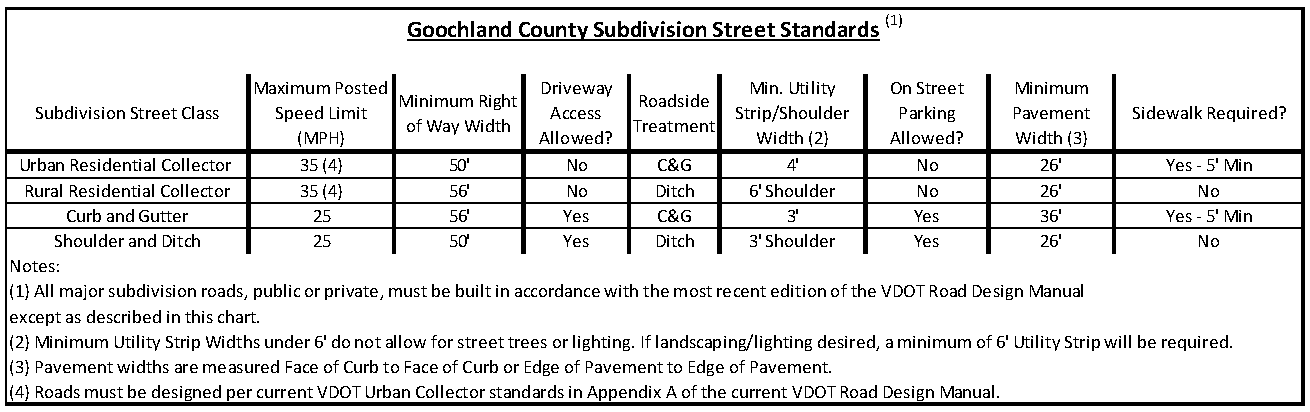 Unless a higher standard is required by this chapter, the subdivision ordinance, or the Goochland county Fire Prevention Code, road design and construction standards must comply with VDOT standards.