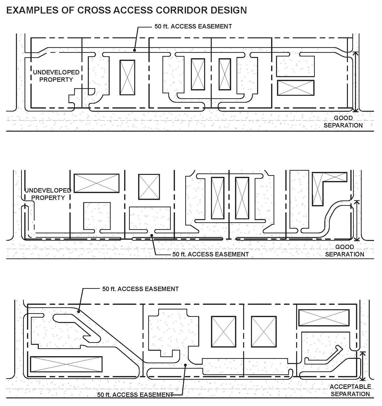 Adjacent commercial or office properties classified as major traffic generators (e.g., shopping centers, office parks) must provide a cross-access drive and pedestrian access to allow circulation between premises. Figure 1 below illustrates examples of cross-access corridor design. An access plan must be provided at time of plan of development review.