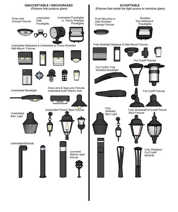 Specifications of the light fixtures, which may include designation as illuminating engineering society of North America "cut-off" fixtures, manufacturers' catalog cuts, or other product information. Refer to Figure 3 at the end of this article for examples of acceptable fixtures.