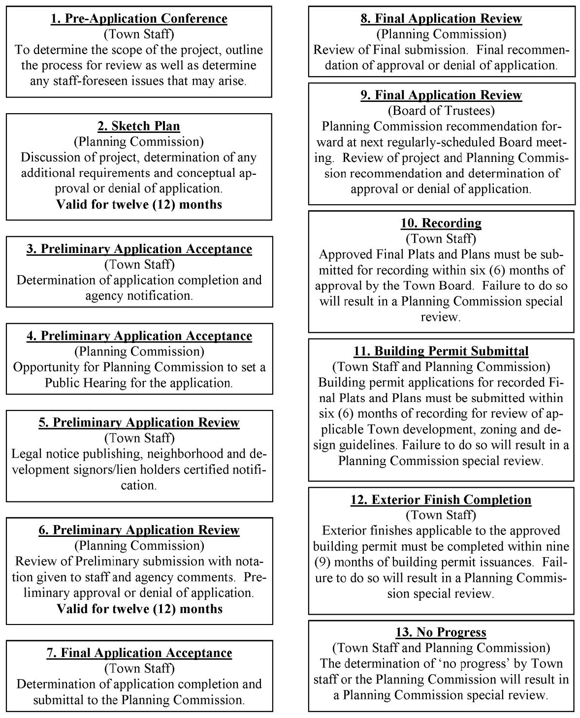 Pre-Application Conference. Applicants are strongly encouraged to have a Pre-Application Conference with Town staff prior to Sketch Plan submittal. The Pre-Application conference with Town staff will help outline the process for review and submittal, as well as allow the opportunity for developer to receive adequate information from Town staff about development projects.