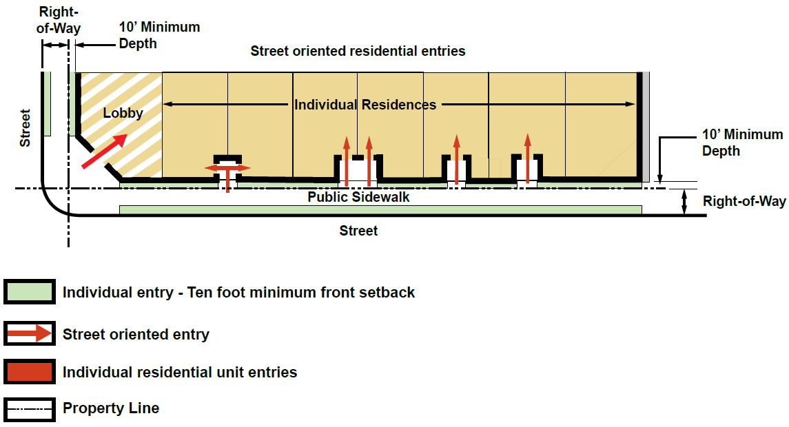 Individual Residential Unit Entries. Multi-family residential buildings with exterior residential unit entries shall front and be setback a minimum of ten feet from the public sidewalk. Entries shall be linked to the public sidewalk with a ten-foot minimum width access walkway, ramp, and/or stairs as illustrated in Figure 18.64.050 A.