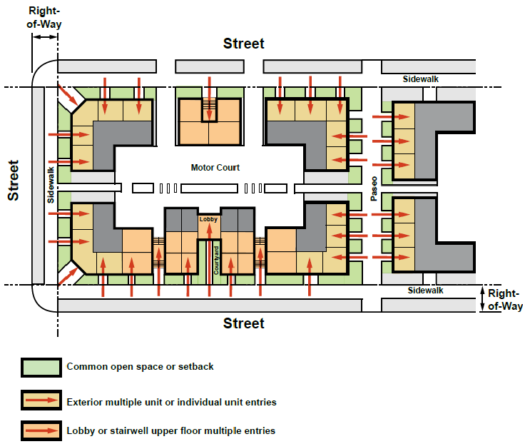Common Open Space-oriented Entries. Multi-family residential building primary entries are permitted to be located at the first floor and directly accessible from publicly accessible common open space paseos, courtyards, plazas, or a street fronting residential setback as illustrated in Figure 18.64.050B. Common open space entries shall have direct sightlines and continuous and unobstructed universal access sidewalk routes between the entries and the street public sidewalk.