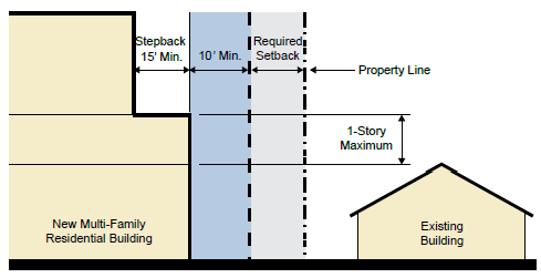 Minimum Requirements. When a multifamily residential building is constructed adjacent to any parcel that includes an existing structure, a 15-foot setback is required wherever the multifamily building is located within ten feet of a required side or rear setback. The setback shall be for stories that are one story greater than the highest roof line elevation of any existing residential structure.
