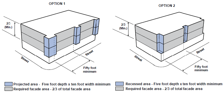 Facade Modulation. As illustrated in Figure 18.64.050D, all building facades shall be articulated horizontally a minimum of every 50 feet along all sides, using facade projections, recesses, or step backs of upper floors. Façade area used to meet this standard shall be a minimum of five feet in depth and ten feet in width and shall be articulated vertically a minimum of two-thirds of the height of the structure.