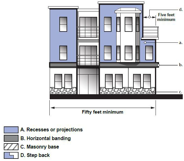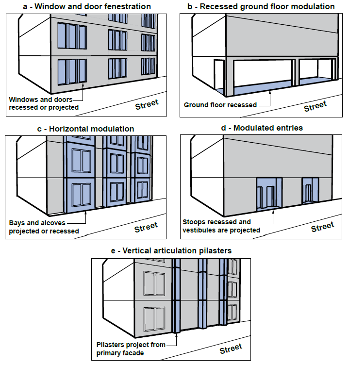 Façade Articulation. Articulation of any facade greater than 20 feet in length along any street-facing frontage, or 30 feet along any façade. These facades shall be articulated by incorporating at least three of the following features each of which is illustrated in Figure 18.64.050E: