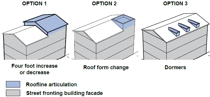 Option 3—Articulation of the roofline utilizing of one of the following- dormers, gables, varying height cornices, and/or clerestory windows.